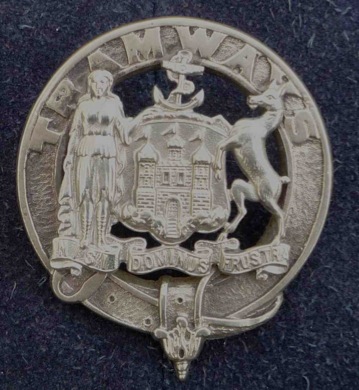 After taking over the operation of its system from the lessee, the corporation embarked upon the not insignificant task of rebranding the enterprise, including of course, staff uniforms and insignia. For drivers, the corporation merely continued the uniform policy of its predecessor, only changing those items that were company specific, namely, the buttons and the cap badges. Drivers therefore continued to wear double-breasted, lancer-style tunics with five pairs of nickel buttons (bearing the corporation arms — see link) and stand-up collars; the latter carried an employee number in individual nickel numerals on both sides. The tensioned-crown peaked caps now bore a script-lettering grade badge — 'Driver' — above which a new nickel cap badge was worn; this comprised the arms of Edinburgh above the city motto (in a ribbon), all surmounted by a curved banner inlaid with blue enamel, containing the word: 'TRAMWAYS'. In contrast to the approach outlined above, conductors' uniforms were changed to a completely different style from that of the E&DTCo, namely: single-breasted jackets with five buttons, two breast pockets (with button closures) and stand-up collars; the latter again bore employee numbers on both sides. For reasons now lost in the mists of time, the corporation chose to issue conductors with rather old-fashioned drooping-peak caps, though these appear to have been relatively quickly superseded by the same style of tensioned-crown peaked cap worn by drivers; the caps bore an off-the-shelf, script-lettering grade badge — 'Conductor' — above which, the new cap badge was worn.