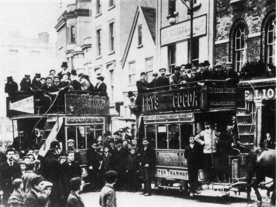 A photograph of two horse trams at the junction of High Street, Paris Street and Sidwell Street — photo undated, but possibly taken in the 1890s. The two drivers are wearing bowler hats and long coachman-style overcoats. Photo courtesy of the Tramways and Light Railway Society, with thanks to David Voice.