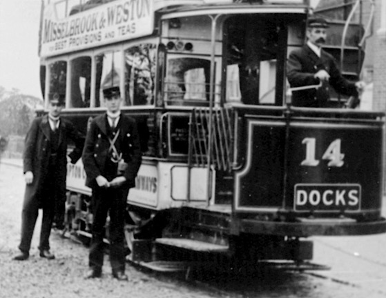 A conductor and a motorman with Tramcar No 14 outside Portswood Depot with a service bound for the Docks — photo undated, but probably taken in 1900 or 1901. The man on the left, in the frock-style coat with the large oval cap badge, is almost certainly a ticket examiner. Photo courtesy of the Tramways and Light Railway Society, with thanks to David Voice.