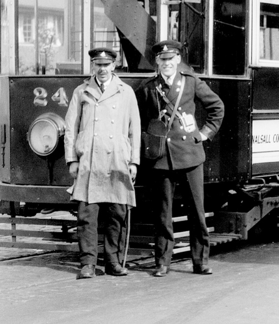 A motorman (in summer dustcoat) and a conductor, with Tramcar No 24 at Wednesbury in 1931. By this time the jackets had been changed to a much more modern double-breasted design with lapels. Both men are wearing soft-topped caps with a new style of cap badge. Photo by H Nicol, courtesy of the National Tramway Museum.