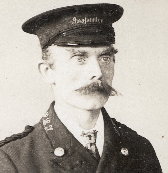 A single studio portrait of an SLT inspector has survived, which shows that in the early years of the system, they wore double-breasted jackets with two rows of five buttons, the top set buttoning through the lapels; the upper part of the latter (the collars) bore embroidered system initials — 'S L T' — on both sides. The jacket also bore braided epaulettes. Caps were in a military style with a tensioned crown (top); they were embellished with braiding and bore the grade — Inspector — in embroidered script lettering. It is currently unclear what uniform was worn in later years.