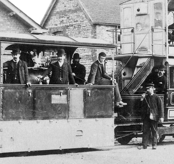 A blow-up of the above photo showing the driver (third from left, presumably) and the conductor (standing, whistle in hand). The driver is wearing an informal jacket and tall bowler with upturned brim (popular in the 1880s), with the conductor, also in informal attire, in a soft-topped, peaked cap, all seemingly devoid of insignia.