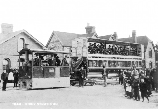 Steam Tram No 1 (a Thomas Green & Sons product of 1887) stands in the depot yard at Stoney Stratford. Although the photo is undated, the fact that the engine is in very good condition and the trailer is unencumbered by advertisements, strongly suggests that it was taken in the late 1880s.
