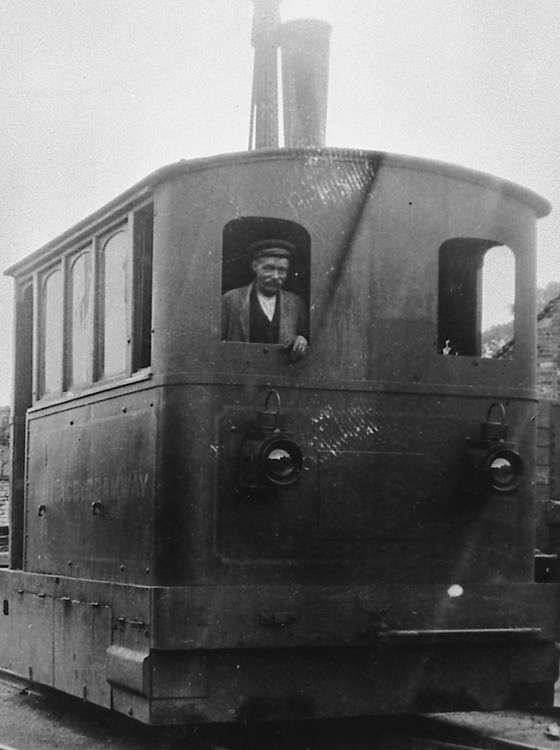 The driver of Engine No 6 poses for the camera outside the small engine shed at Wantage — photo purportedly taken in 1923. The driver appears to be the same man who we see in the 1915 shot of No 6 shown above. Photo courtesy of the Tramways and Light Railway Society, with thanks to David Voice.