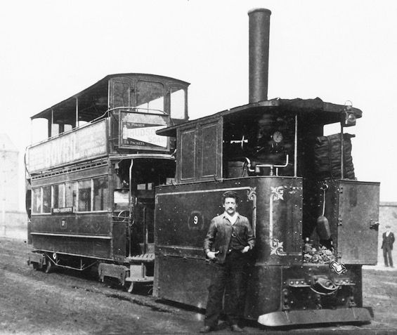 SSTCo No 9 (a Beyer Peacock engine) stands at Dudley Station with Trailer No 17 on a Dudley to Handsworth service — photo undated, but probably taken in the mid-to-late 1890s. Photo courtesy of D G Harvey, with thanks to Trevor Preece.