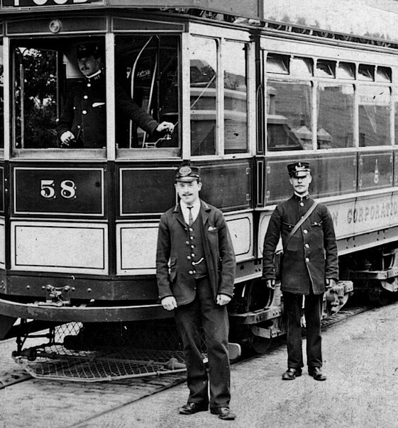 A driver, an inspector (probably) and a conductor pose with Tramcar No 58 at Brownhill around 1901/2. Neither the conductor nor the motorman (called 'drivers' in Blackburn) are wearing a licence badge. Photo courtesy of Duncan Holden.