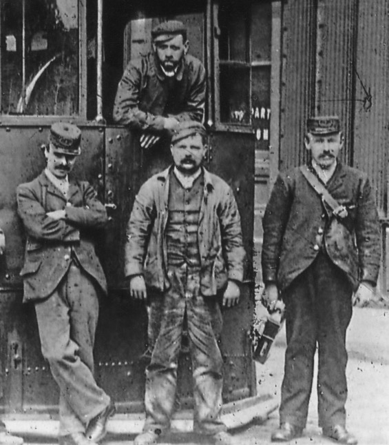 An enlargement of the above photograph showing some of the tramwaymen, from left to right: an inspector, a driver, a stoker (or another driver) and a conductor (the latter with fare collection box in hand). The driver and the stoker are wearing typical railway footplate-like attire, whilst the conductor is clearly wearing a uniform jacket with a kepi-style cap bearing an embroidered cap badge.
