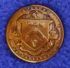 Comment A coat of arms was not officially granted to the Borough of Darlington until 1960, so the arms shown are unofficial and can therefore only be regarded as 'assumed'. The train (locomotive and waggons) refers of course to the Stockton and Darlington Railway, the bull's head to the local, pioneering work done in breeding shorthorn cattle, whilst the date (1867) refers to the founding of the municipal borough.