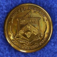Button description (Pattern 2) Title (‘COUNTY BOROUGH OF DARLINGTON’) within a scalloped rim, surrounding the municipal device (a shield bearing a chevron, a bull's head, and a locomotive and waggons) with a crest comprising a miner's arm holding a pick, all above the motto: 'FLOREAT INDUSTRIA'
