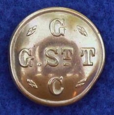 Button description Upper case initials, 'GG.STTC', arranged in a cross formation between four flags, within a raised rim