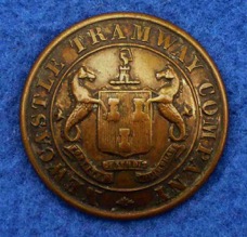 Button description (1885-1888) Title (‘NEWCASTLE TRAMWAY COMPANY’) within a border, surrounding the arms of Newcastle (a shield with 3 towers) with a tower and lion crest, and seahorse supporters, all above motto: ‘FORTITA DEFENDIT TRIUMPHANS’.
